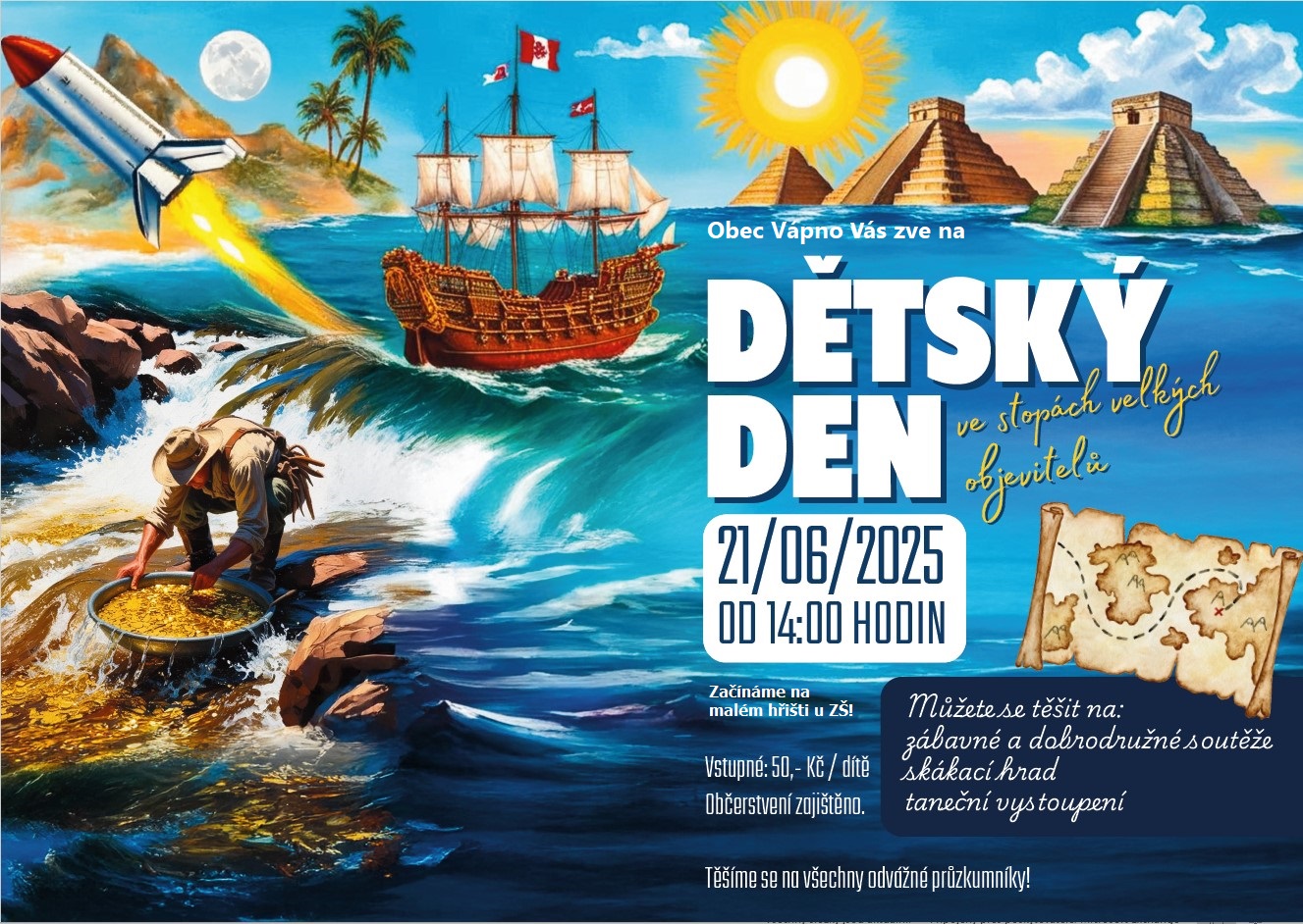 Srdečně zveme všechny malé průzkumníky na velký dětský den do Vápna. Začátek je 21. června od 14.00 hodin, jako vždy na malém hřišti u ZŠ.