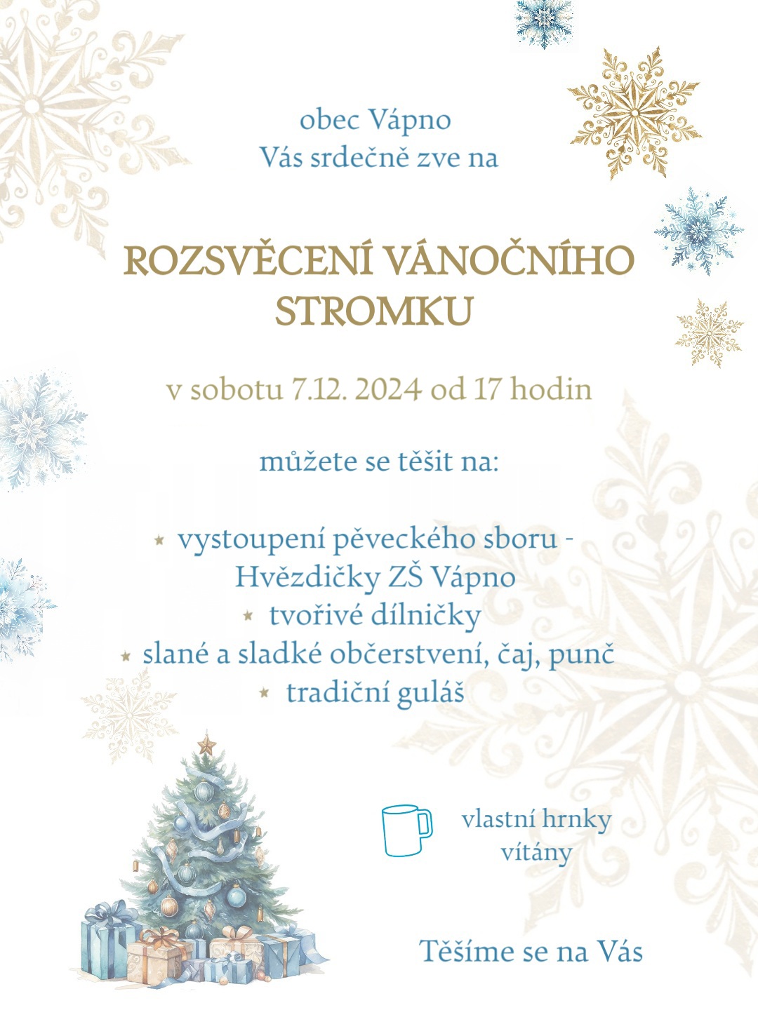 Obec Vápno Vás srdečně zve na rozsvícení vánočního stromku, které se bude konat v sobotu 7.prosince od 17.00 hodin před obecním úřadem.