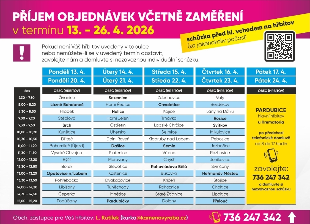 Kamenictví Kůrka bude ve středu 15.4. a poté 22.4. přijímat objednávky na opravy hrobů a veškeré kamenické práce.