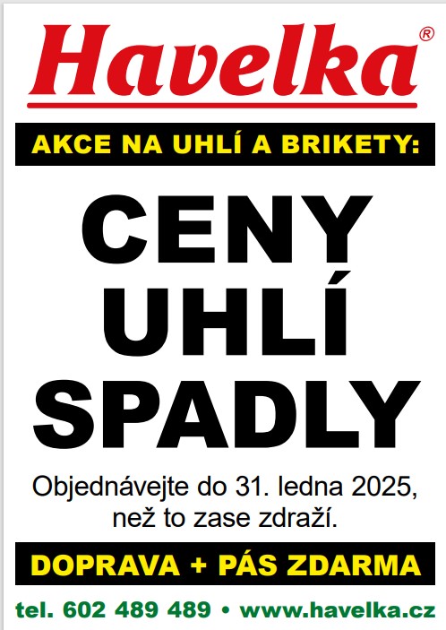 Uhelné sklady nabízí akci "Fixace ceny uhlí" při objednání do 31.ledna 2025. Akce umožňuje zákazníkům objednat uhlí za výjimečně nízké ceny.